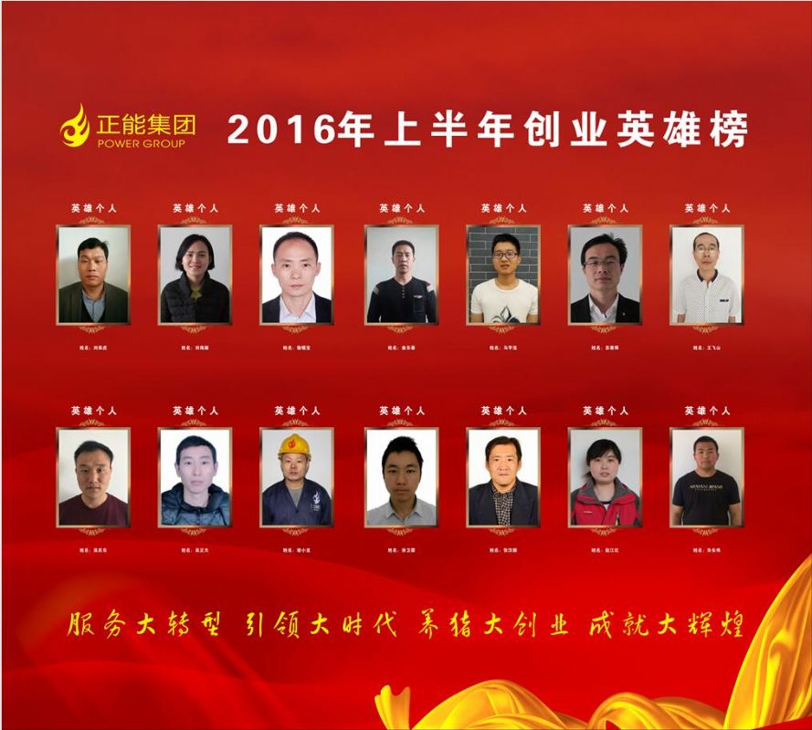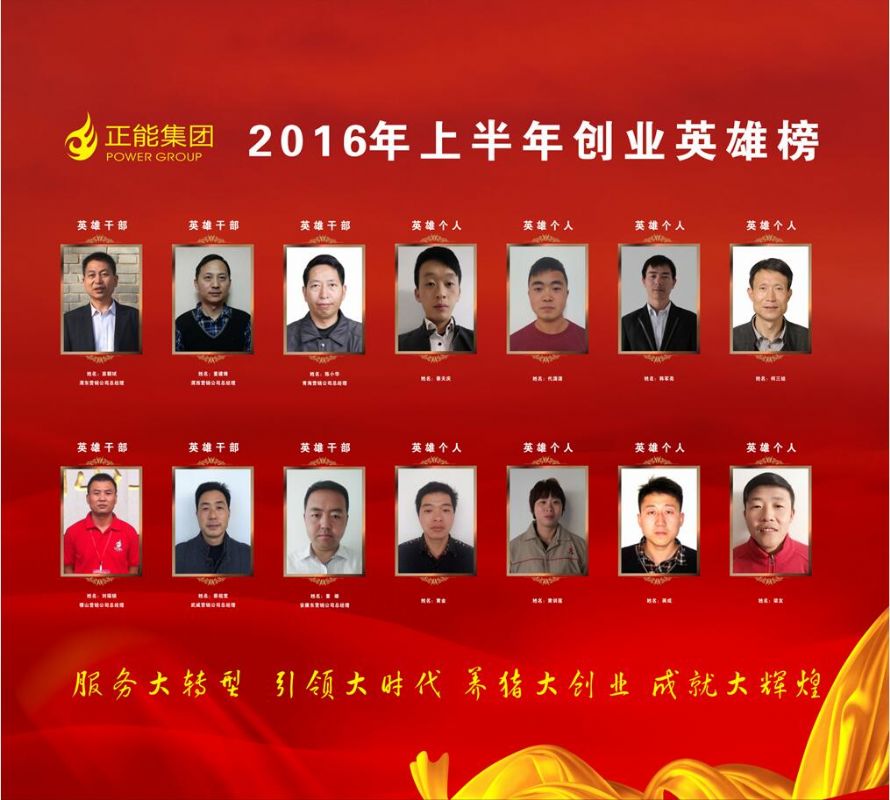 2016年7月19日晚19:00-21:00,“正能集團股權轉讓儀式暨2016年上半年創(chuàng)業(yè)英雄頒獎晚會”在西北革命圣地-銅川照金隆重舉行。今夜的照金賓館五樓會議廳華燈璀璨、高朋滿座,正能集團總裁王義輝、集團產(chǎn)品技術總監(jiān)連星、財務總監(jiān)朱武寧、高陵基地總經(jīng)理白萬禮、渭南、西安、咸陽、甘肅、山西、隴東等事業(yè)部、營銷公司總經(jīng)理出席晚會。正能創(chuàng)業(yè)英雄戰(zhàn)將共計100余人參加本次晚會。本次大會以“服務大轉型、引領大時代、養(yǎng)豬大創(chuàng)業(yè)、成就大輝煌”為主題,以開闊的視野、創(chuàng)新的形勢,引爆巨大能量場,聚英雄氣概,展團隊風采,亮大帥風姿,迸發(fā)激情,總結2016上半年輝煌成就,斗志昂揚,展望2016下半年宏偉藍圖。 獎項設置:英雄個人:100G純銀打造的正能英雄獎章 共22人。 英雄干部:100G純銀打造的正能英雄獎章 共6人。